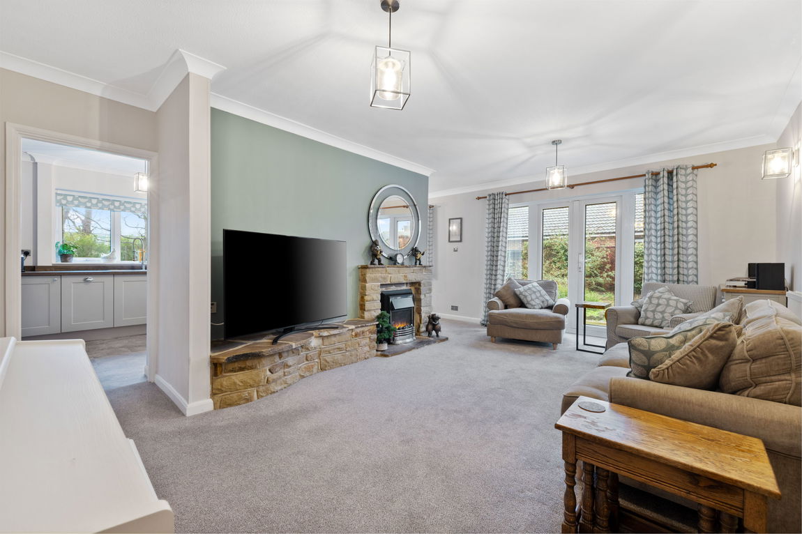 The welcoming entrance porch provides useful additional storage before leading into the heart of the home. The living room is warm and inviting, featuring a charming fireplace that offers a subtle nod to the property’s character and heritage.