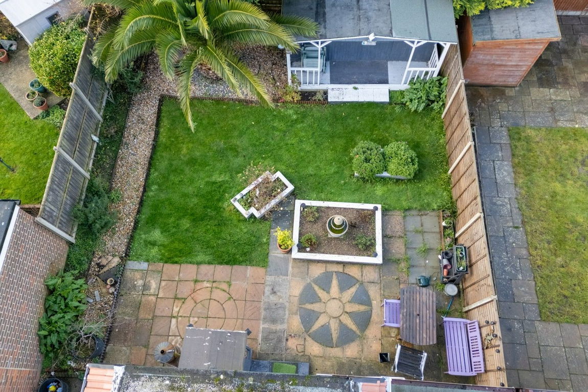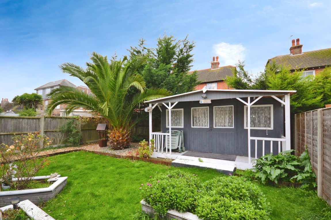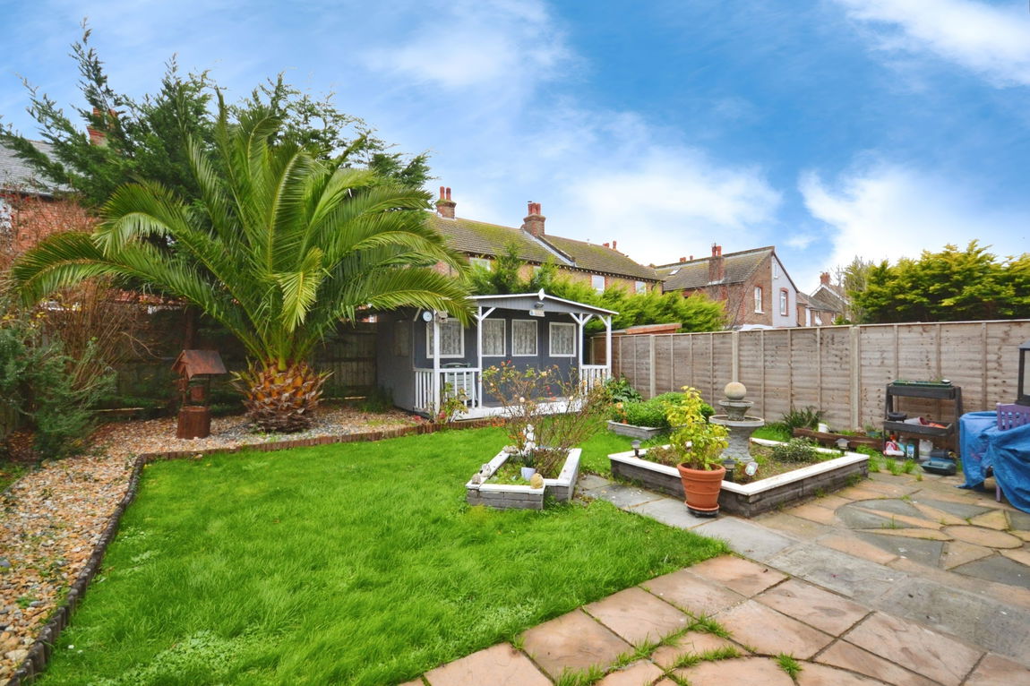 The rear garden is a comfortable 10.5 x 12 metres, has a large summer house with screening from an attractive, giant palm tree.