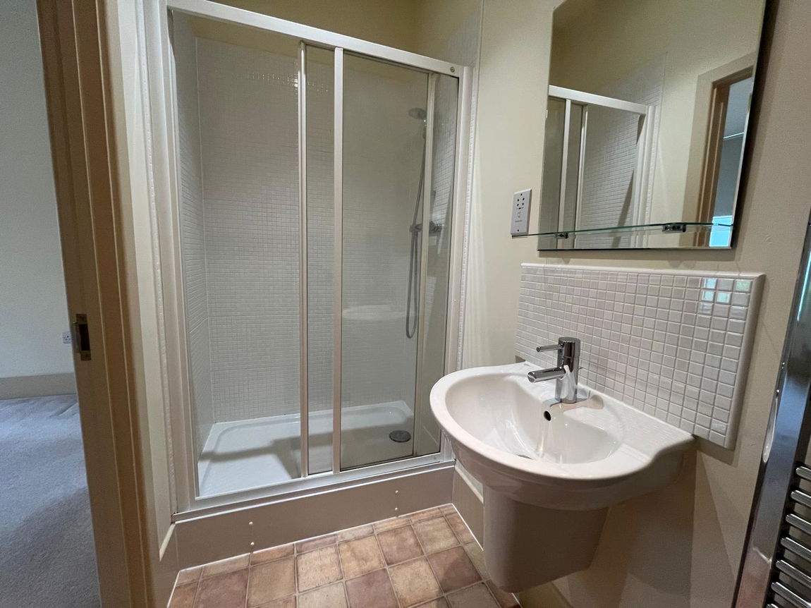 High skimmed ceiling with downlights, double glazed sash window to rear aspect, low level w/c, wash hand basin, bath with chrome tap and shower attachment. Wall mounted heated towel rail, extractor fan, shaving point and tile effect flooring.