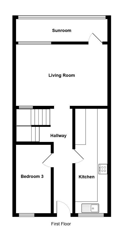 Accessed via steps to the rear, the property benefits from its own private entrance, providing a sense of privacy and independence. The ground floor features a modern fitted kitchen, a generously sized living/dining room ideal for both relaxing and entertaining, a bright and airy sun room and a well-proportioned third bedroom offering flexible use as a guest room, office, or additional living space.